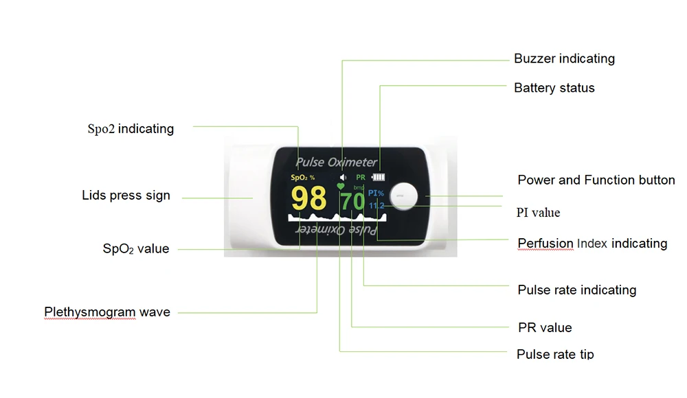 Short press power and function switch button for 1 second to power on, enter the SpO2 measurement mode directly.